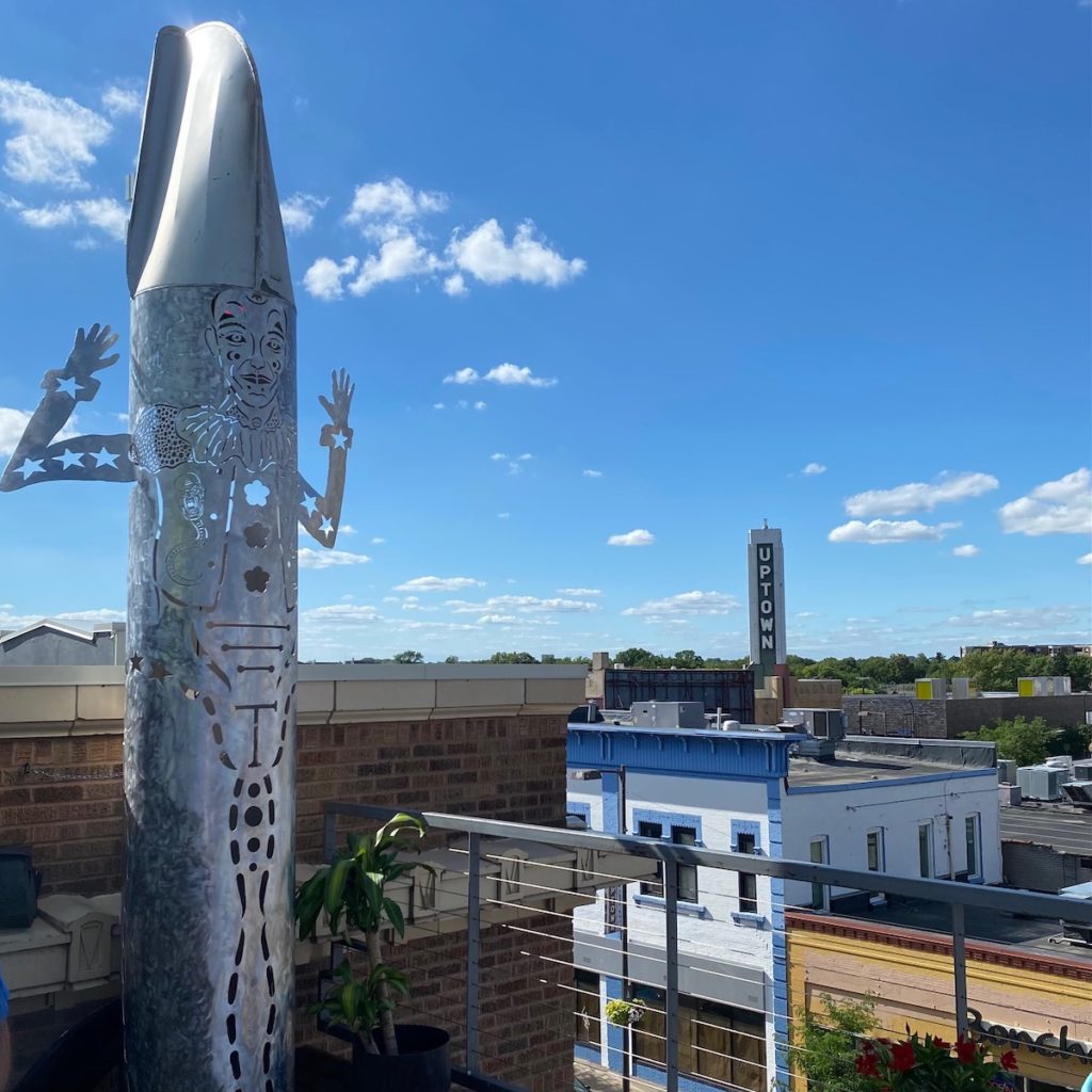 But development is underway on a restaurant and entertainment venue that could get consumers excited about venturing into Seven Points (formerly Calhoun Square) once again. And this weekend, art fair visitors will get a small taste of what’s to come as Arts + Rec Uptown debuts its new rooftop bar and restaurant serving “gastrofair”—elevated fair food like Dorito-crusted cod, fried pickles, and breakfast waffle dogs along with craft cocktails, local beers, boozy popsicles, and non-alcoholic options. It’s phase one of a project that will become one of Seven Point’s largest tenants, occupying 20,000 square feet on both rooftop and first floor, where a restaurant, bar, and mini golf entertainment concept is currently under construction with plans to open this fall. Both spaces will be decorated with original works for numerous local artists. The rooftop features murals by Martzia Thometz and Bo Young An and metal sculptures by Allen Christian who designs under then name House of Balls.