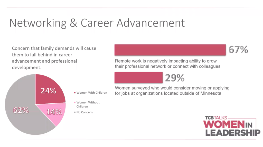 Two-thirds of the women surveyed by TCB x Greater MSP reported negative effects of working remotely on their ability to grow their professional network. A fourth of women with children surveyed reported concern that they will be held back in their careers as a result of increased family obligations due to Covid-19. That finding echoes McKinsey’s Women in the Workplace 2020 survey which found that one in four women are contemplating downshifting their careers or leaving the workplace completely.