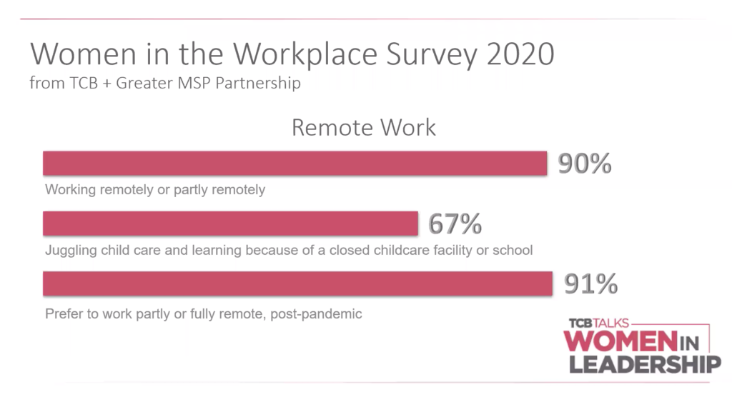 Women surveyed by TCB and Greater MSP overwhelmingly favored workplace flexibility: 91 percent said they would prefer to continue working remotely or partly remotely even post pandemic. “Now there’s the expectation that we don’t have to physically be close,” Skanson said. “It’s part of the new normal we have to get used to—flexibility and choice will be required.”