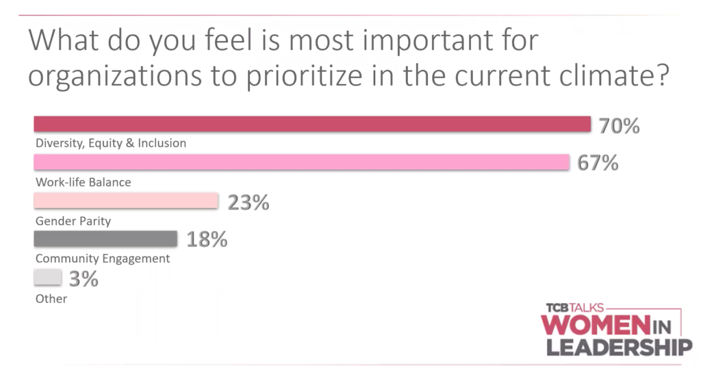 Results of the survey conducted in late September of more than 300 Minnesota professionals were shared Monday at TCB Talks: Women in Leadership (watch the entire webinar here). This year’s virtual event featured a conversation with Best Buy CEO Corie Barry, Allete president and CEO Bethany Owen, Cargill president of business services Kim Skanson, and Ecolab senior vice president of global marketing and communications Gail Peterson. Flexibility, employee well-being, and stepped-up diversity and inclusion efforts were key themes during the panel discussion.
