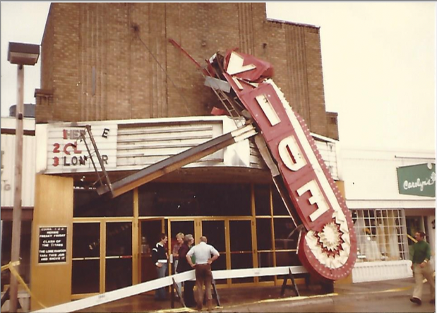 Steve Mann surveys damage to the Edina Theatre sign after a storm in the late 1970s.