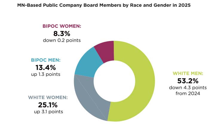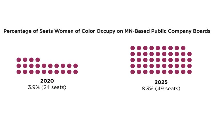 Women of color hold the smallest share of public company board seats—after white men, white women, and BIPOC men—in Minnesota and the United States. But they’ve more than doubled their portion of seats in Minnesota since 2020 to 8.3% in 2025 and they’ve made measurable progress at the national level.
