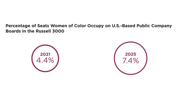 BIPOC women and men made representation gains during the Floyd racial reckoning period. By the second quarter of 2025, people of color held 18.7% of board seats in the Russell 3000, which includes the 3,000 largest public companies in the United States. Women of color held 7.4% of those board seats.