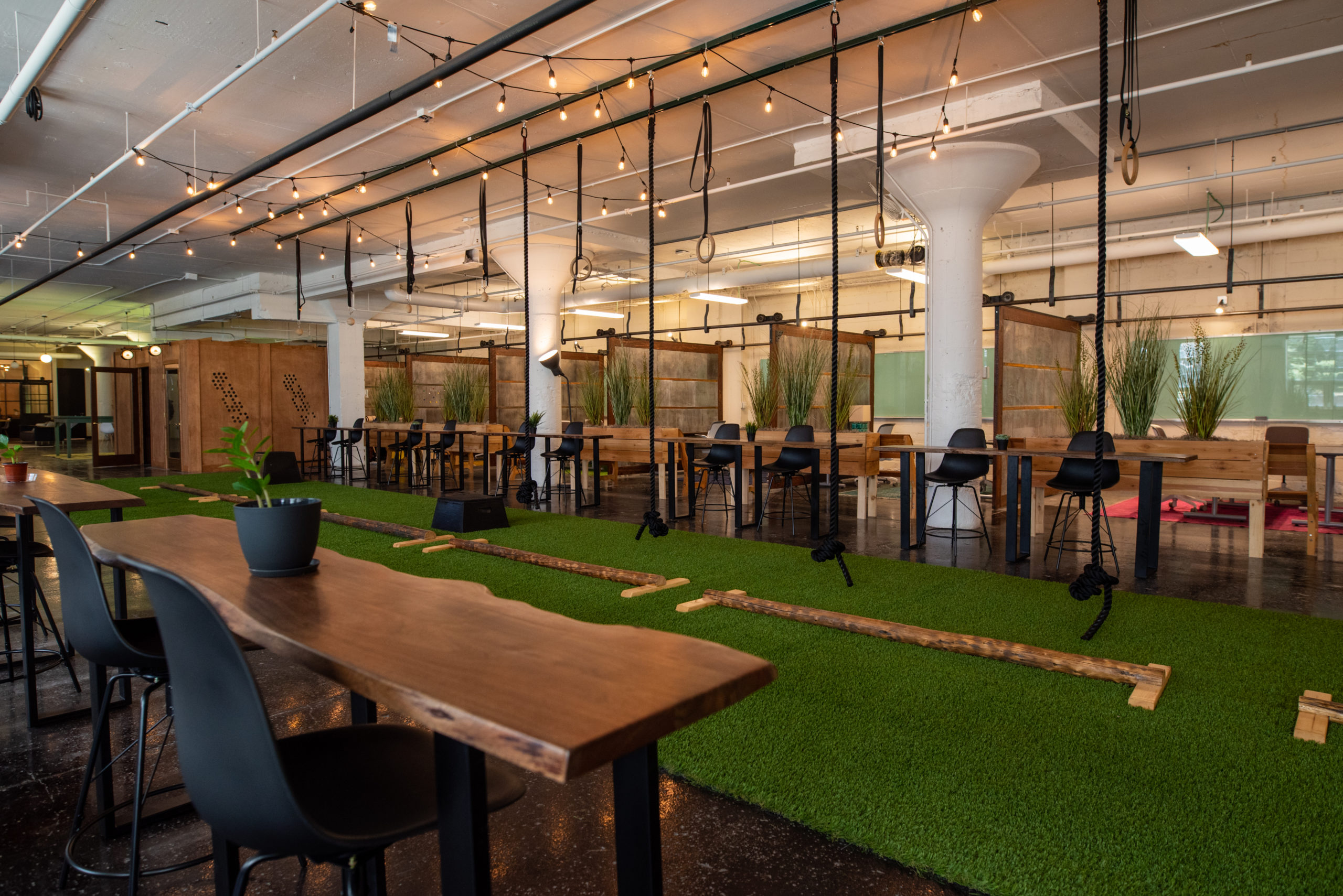 At The Wilderness, you can rock climb between Zoom calls. Fitness equipment is set up in the center of the open space, flanked by desks. There’s an obstacle course, a bouldering wall and cardio machines as well as a yoga studio. The Wilderness offers group fitness classes, including yoga flow and high intensity interval training.