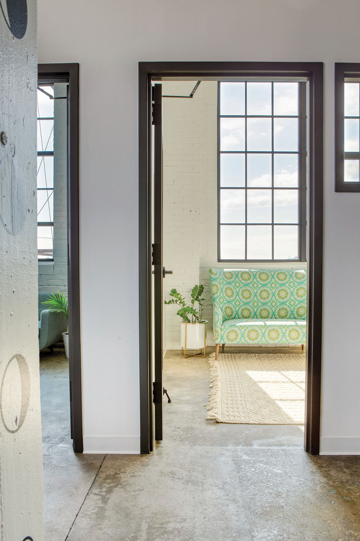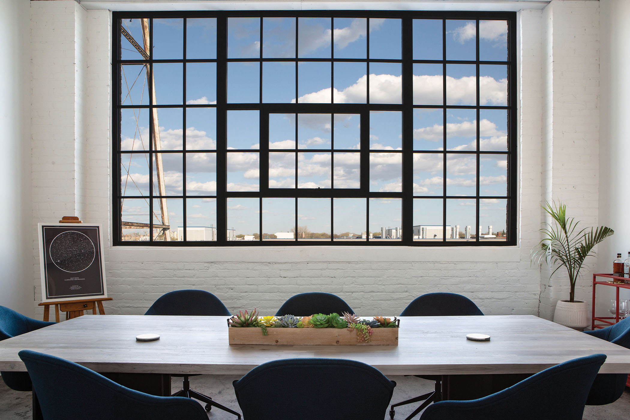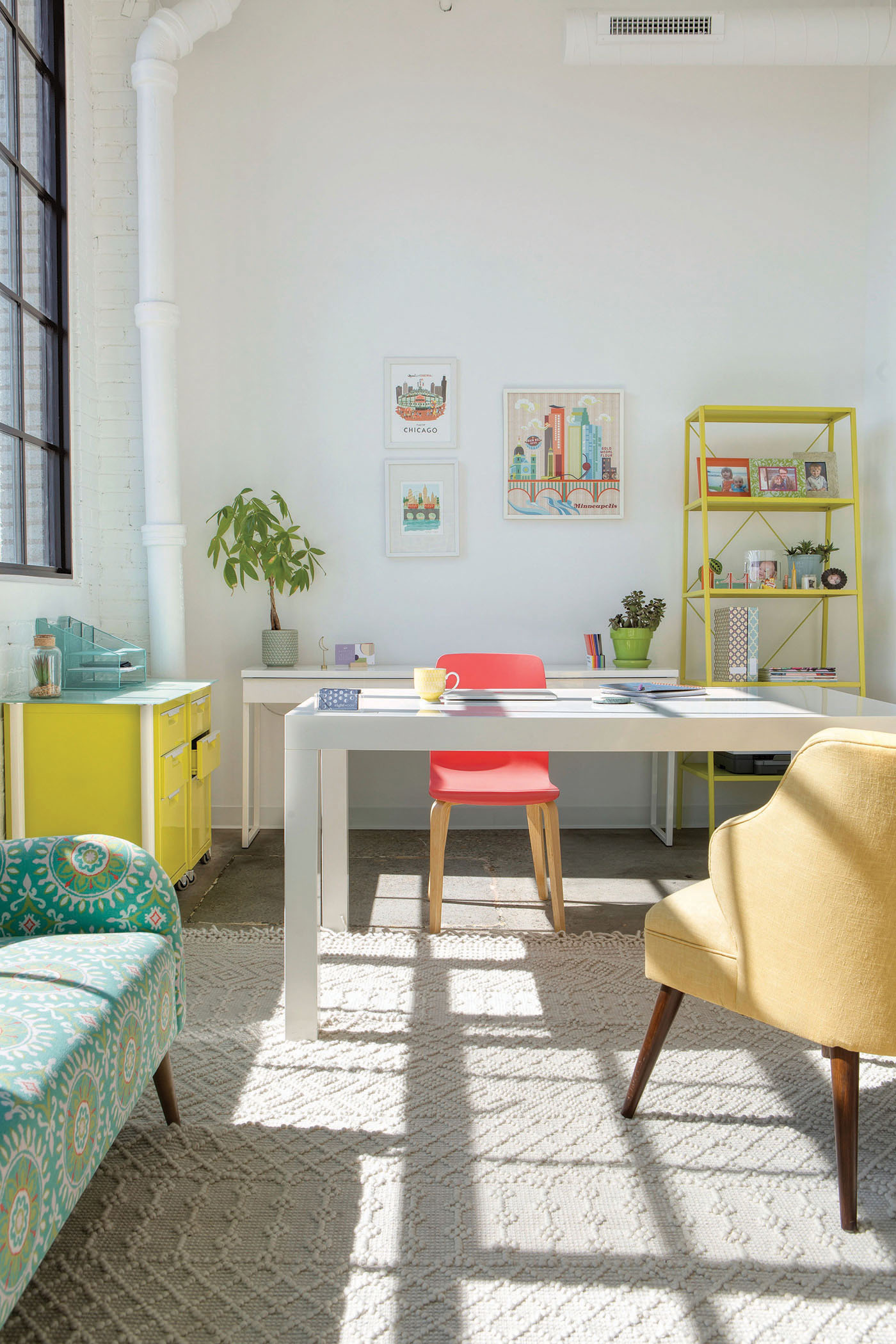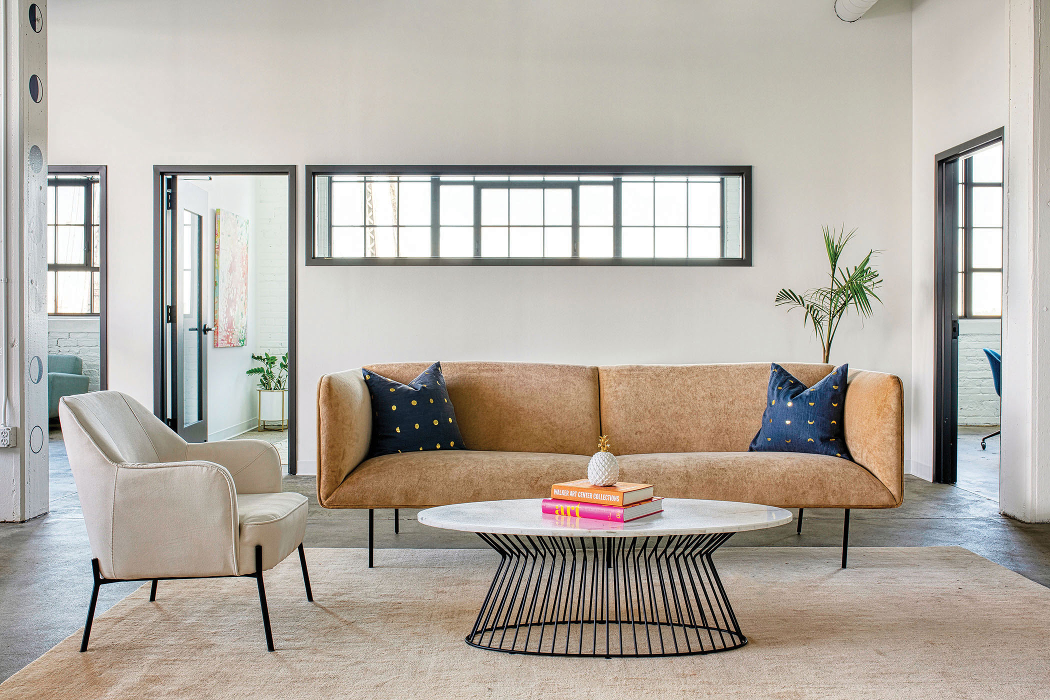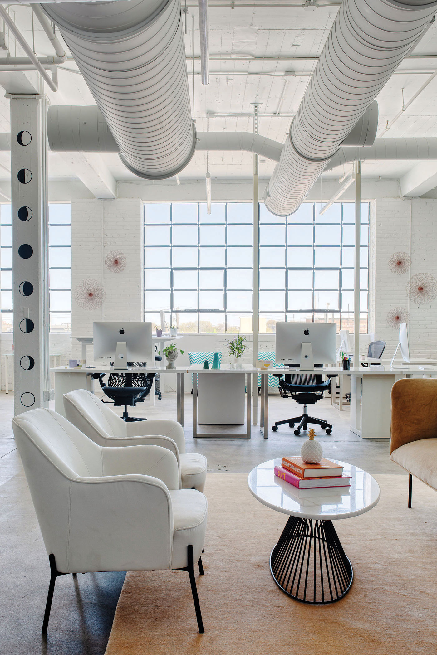 When Eight Moon owner, president, and creative director Megan Junius was designing the new office for her St. Paul creative design and marketing firm, she had one primary goal: make the office a creative haven. Formerly called Peter Hill Design, Junius rebranded the firm as Eight Moon in 2019, a nod to the final phase of the lunar cycle, which according to lore, is when human creativity is at its pinnacle. And since creative innovation has been the company’s core tenet since its 1994 founding, Junius decided it was time to have an office that reflected the brand, its work, and of course, its new name. Junius designed the space herself, with guidance from Shelly Peschel of Melody Hill Design. The 2,800-square-foot, light-washed space in the Vandalia Tower building merges industrial design with contemporary furnishings and pops of color. And the airy, open space promotes collaboration, says Junius. Plus, it’s situated in what’s called the Creative Enterprise Zone, a neighborhood between downtown St. Paul and Minneapolis established in 2013 as a place for artists, makers, and entrepreneurs to come together to create and innovate. The perfect place for more creative juices to flow.