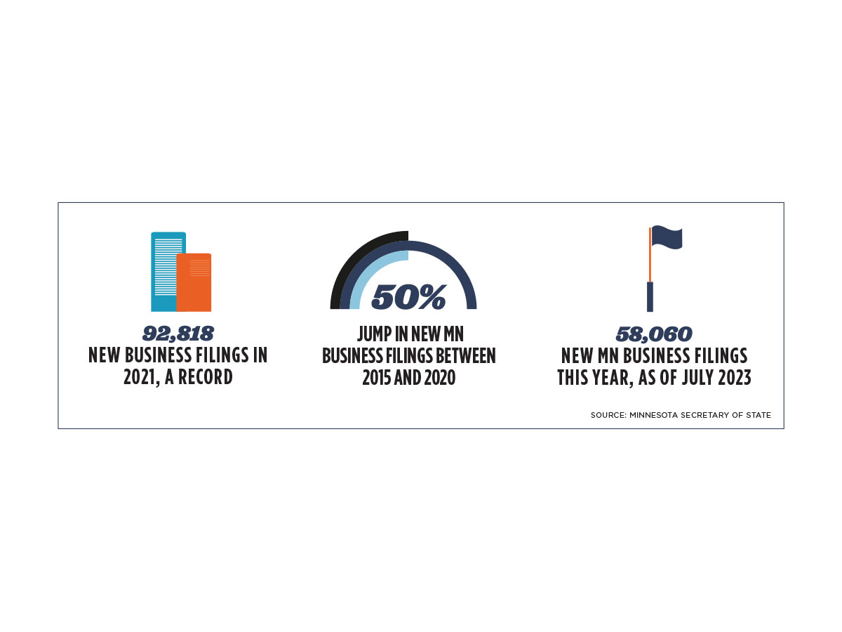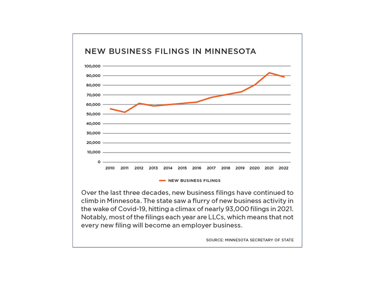 There are some caveats to the Secretary of State’s data. Clearly, not every new business will become a major employer, and some are bound to fail in the first months. Plus, the vast majority of filings each month have been limited liability companies, which could include as few as one or two people. Hansen notes that, theoretically, it can take as little as 10 minutes for someone to file for a new LLC in Minnesota.