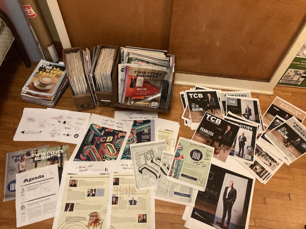 We don’t take for granted the time you spend with us—in print, in person, on tcbmag.com, and via podcasts, newsletters, and social media—and that’s why we took pains to get this right. A great deal of credit goes to TCB art director Mike Novak, who has touched every inch of every page of the magazine you’re holding. He makes it look easy. “I tried to be bold and clean,” he says of the call to think about how TCB could show up in its next era. “It looks so simple up there, but it was a long journey to get to this particular combination.” And when our team—including publisher Shelly Elmore, creative director Michael Norseng, and president of MSP Communications’ Cities Media Group Jayne Haugen Olson—saw it, we knew it was the one.